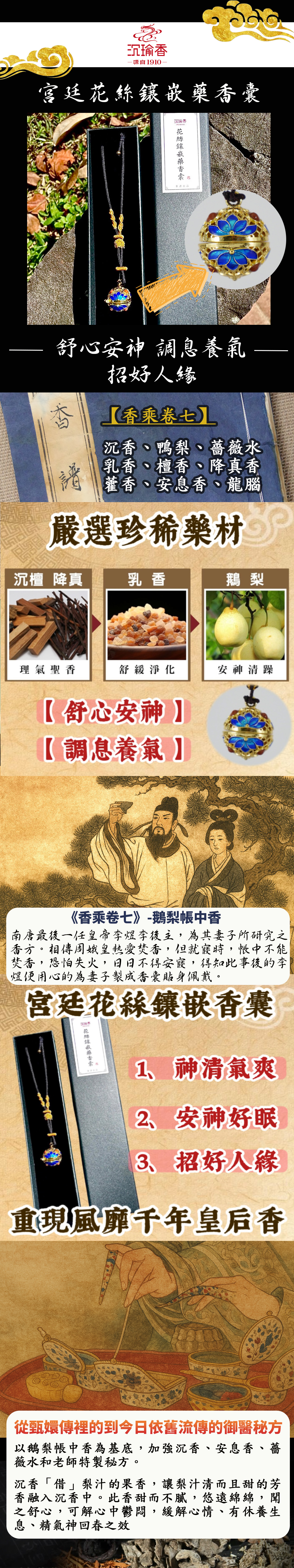 成分:沉香、鴨梨、薔薇水、乳香、檀香、降真香、藿香、安息香、龍腦