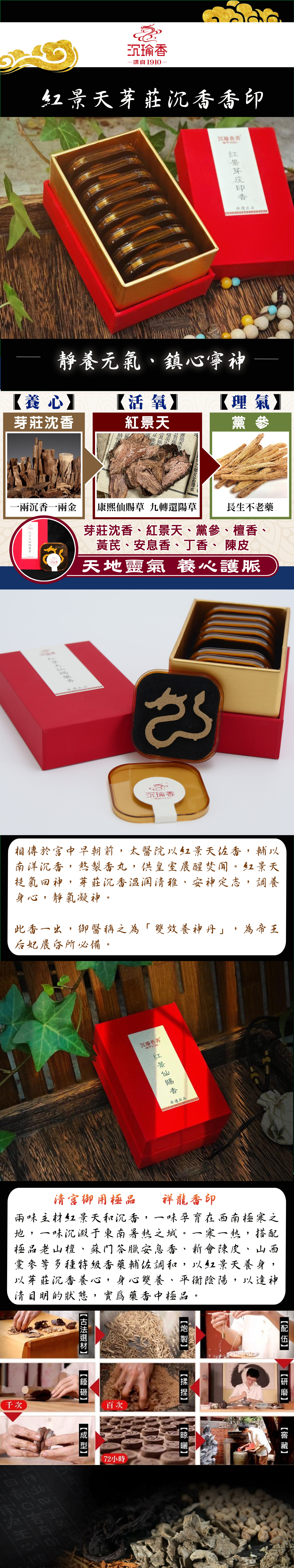 芽莊沉香、紅景天、黨蔘、檀香、黃耆、安息香、丁香、陳皮
